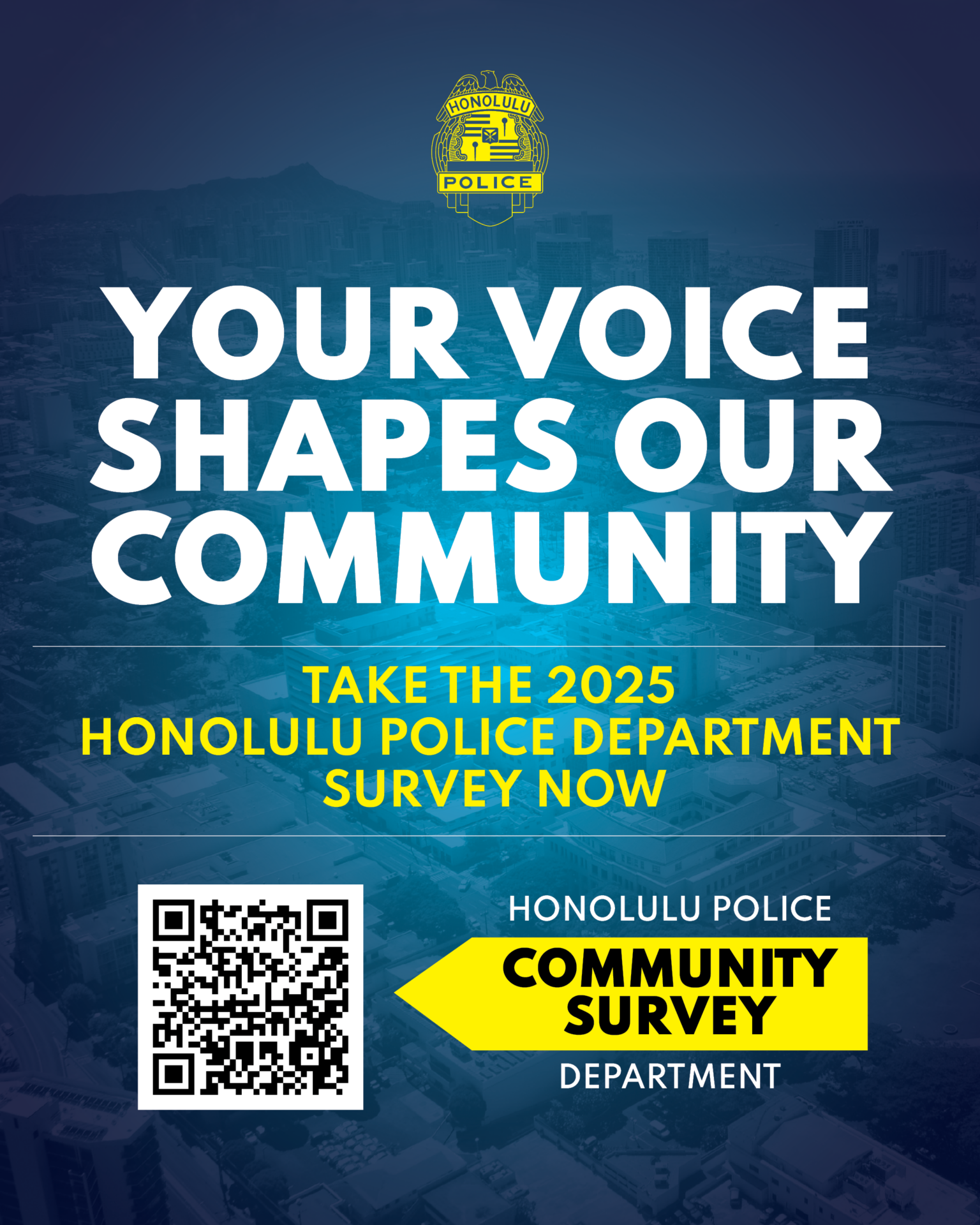 🗣️ Your voice matters! The 2025 Honolulu Police Department Community Survey is open and runs until December 13. Share your thoughts and help shape our community. 💙