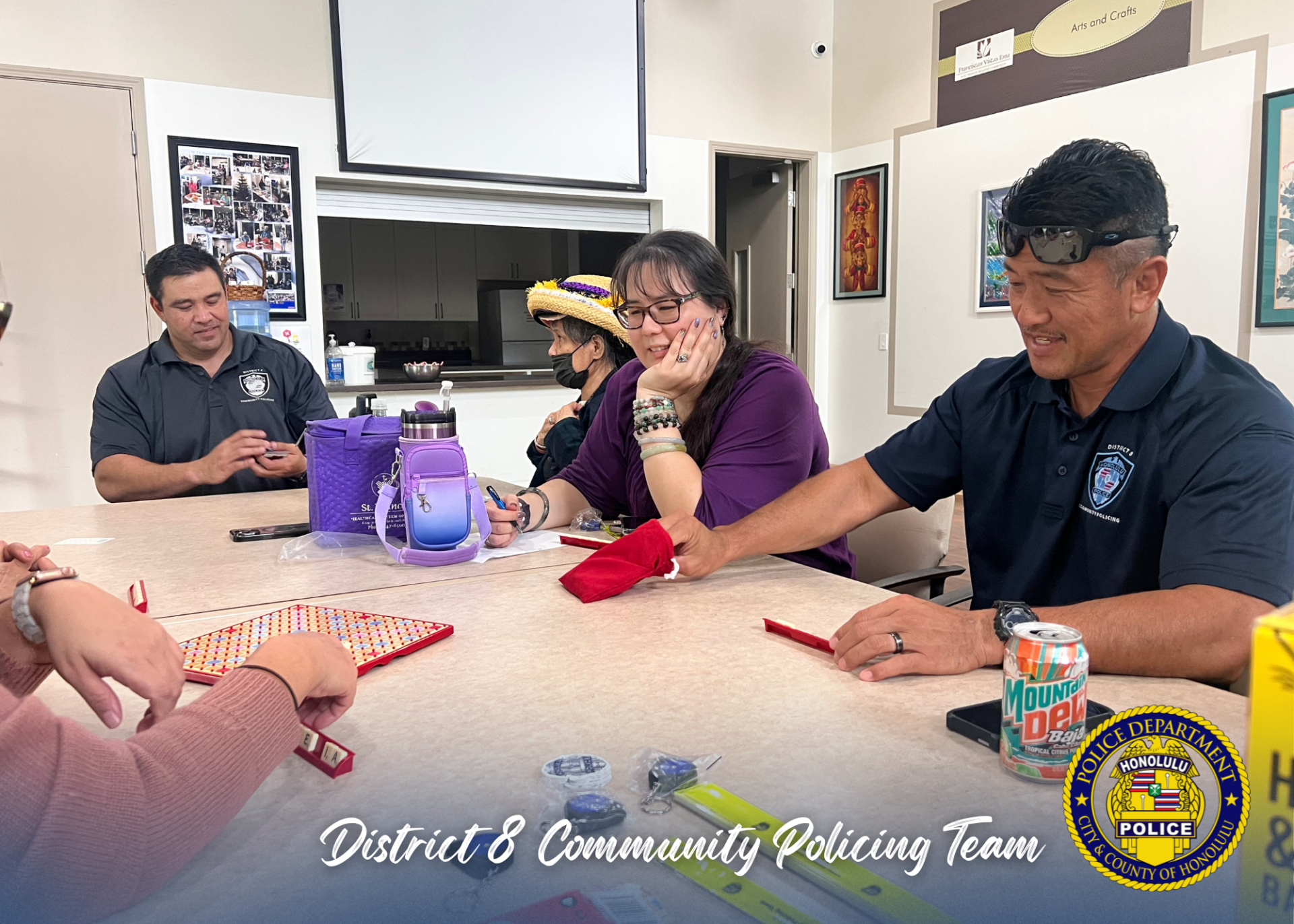 District 8 Community Policing Officers are building trust one board game at a time with Franciscan Vista ʻEwa residents. 🤝 There’s no better way to strengthen bonds than by showing up for community members. Mahalo for allowing us to serve meaningfully. 🙏 #CommunityPolicing #CommunityFirst #BuildingTrust