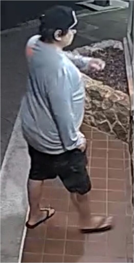 DESCRIPTION OF SUSPECT – Unknown male, heavy build, 5’5” to 5’11” in height, 230 lbs in weight, black or brown hair; wearing a black baseball cap, light colored long-sleeve shirt, dark colored shorts, and slippers.