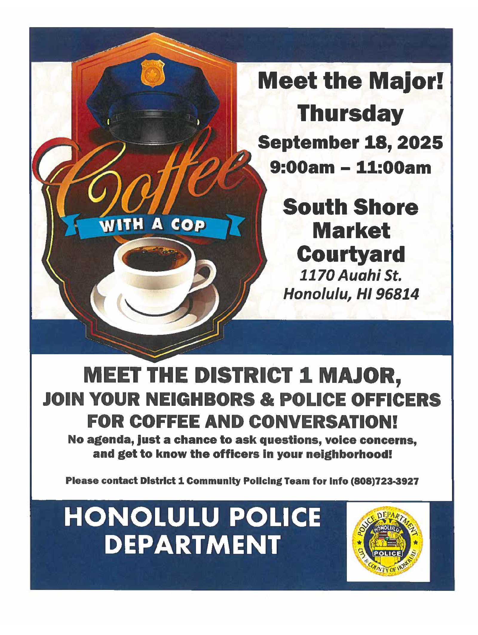 "Waikiki East" Citizen Patrol The District 6 Community Policing Team invites you and your neighbors/friends in the area to join us for some fresh air and good conversation during a Citizen Patrol Walk around the neighborhood. All ages and pets welcome! We will meet up at the big banyan tree by the intersection of Kalakaua/Uluniu, […]