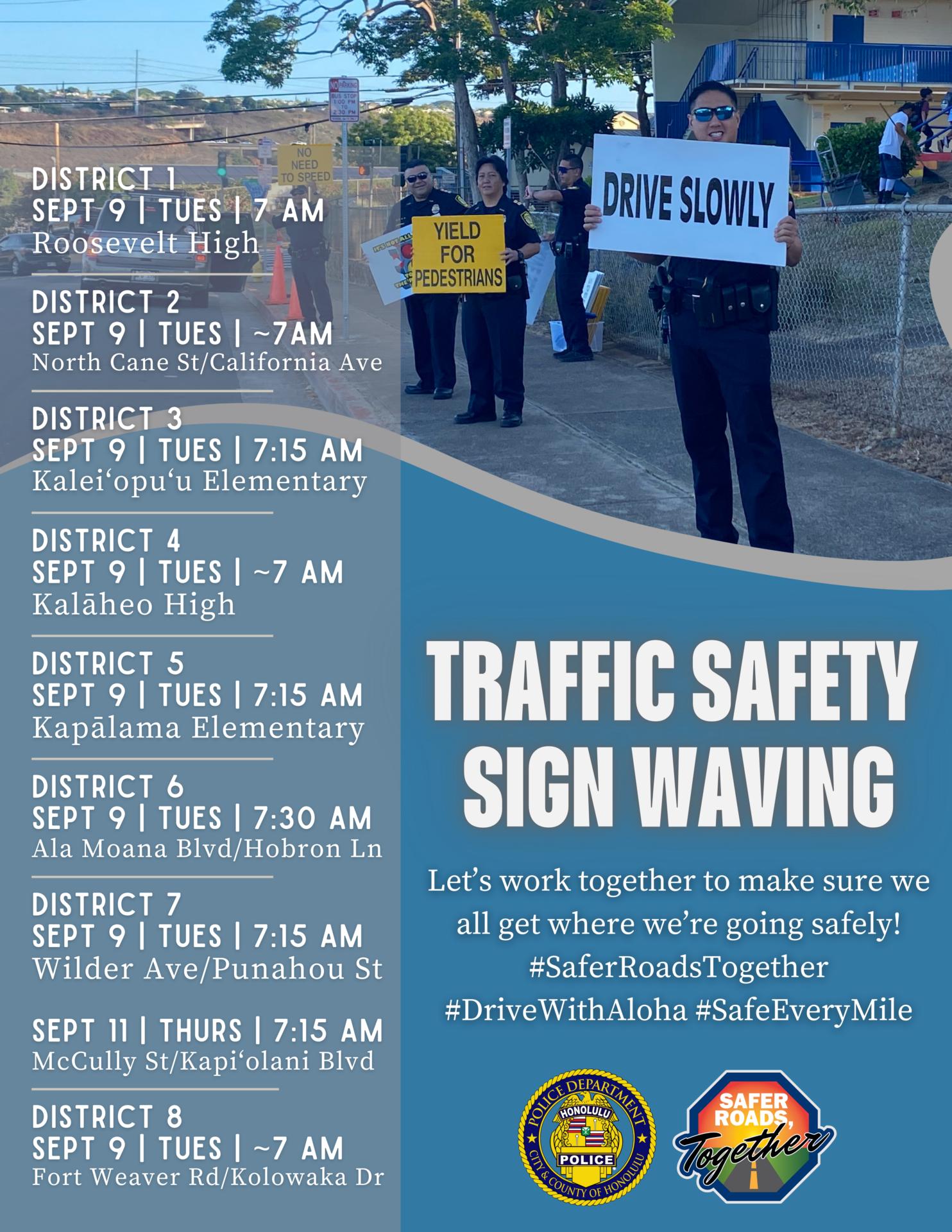 Come and join HPD and students from the community in our Safer Roads, Together campaign! This event will be held at the following areas, dates, and times: 09/09/2025 @ 0730–0800 hoursAla Moana Boulevard and Hobron Lane 09/16/2025 @ 0730–0800 hoursMcCully Street and Ala Wai Boulevard 09/23/2025 @ 0730–0800 hoursKalākaua Avenue and Kapahulu Avenue 09/30/2025 @ […] Come and join HPD and students from the community in our Safer Roads Together Campaign. This event will be held at the following school, please come and show your support. 9-9-25 / 0715 hours @ Kaplama Elem. School 9-16-25 / 0715 hours @ Ka'ewai Elem. School 9-23-25 / 0715 hours @ Likelike Elem. School 9-30-25 […] |
