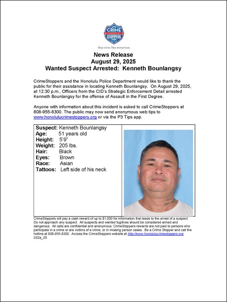 CrimeStoppers: Wanted Suspect Arrested: Kenneth Bounlangsy August 20, 2025 CrimeStoppers and the Honolulu Police Department would like to thank the public for their assistance in locating Kenneth Bounlangsy.