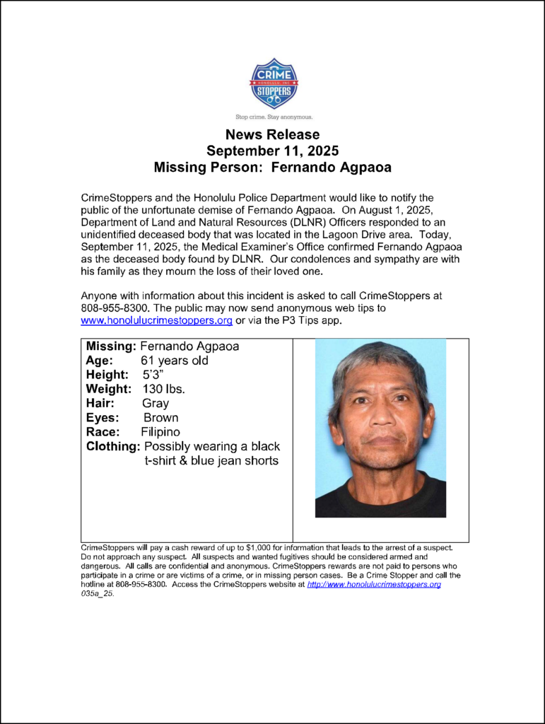 CrimeStoppers: Missing Person Update: Fernando Agpaoa