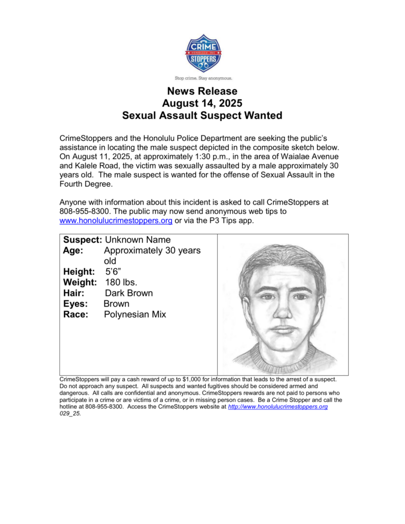 CrimeStoppers: Sexual Assault Suspect Wanted August 14, 2025 CrimeStoppers and the Honolulu Police Department are seeking the public’s assistance in locating the male suspect depicted in the composite sketch.