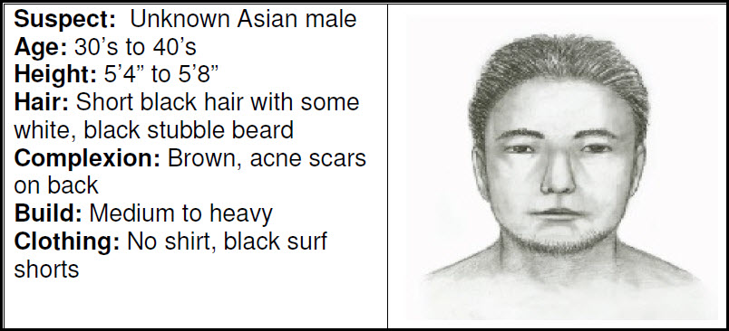 On Monday, January 9, 2023, at approximately 5:30 p.m., the victim was in the ocean behind the Waikiki Police substation with her sister. An unknown male approached them and told them that there were turtles further out. Both females held onto the male as he swam further into the ocean. While guiding them to where the turtles allegedly were, the male sexually assaulted the younger sister then swam away.