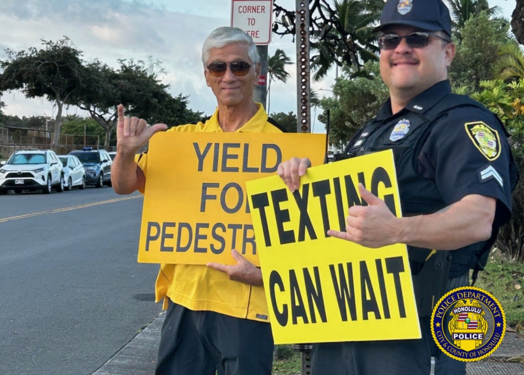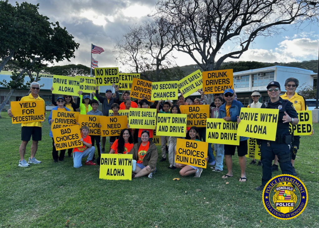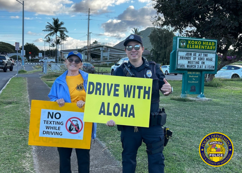 📢 “Stop Texting and Driving,” “Texting Can Wait,” and “Yield to Pedestrians” were just a few of the messages shared by District 7 Community Policing officers in partnership with the Koko Head Elementary Junior Police Officers and the Hawaiʻi Kai Lions Club. Recently, they waved signs for traffic safety awareness to help keep our keiki safe. 🚸
