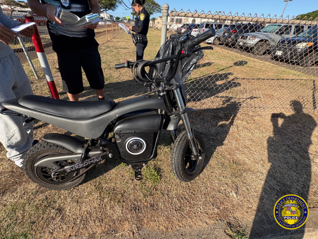 On Monday, April 7, 2025, District 8’s Community Policing Team, Burglary Detail, and Misdemeanor Detail conducted an E-bike/E-Motorcycle Operation in the Ewa Beach area using officers dressed in everyday clothing. Seven citations were issued for a total of 15 violations, 70 warnings were given for helmet and bike registration issues, and five electric dirt bikes were recovered.