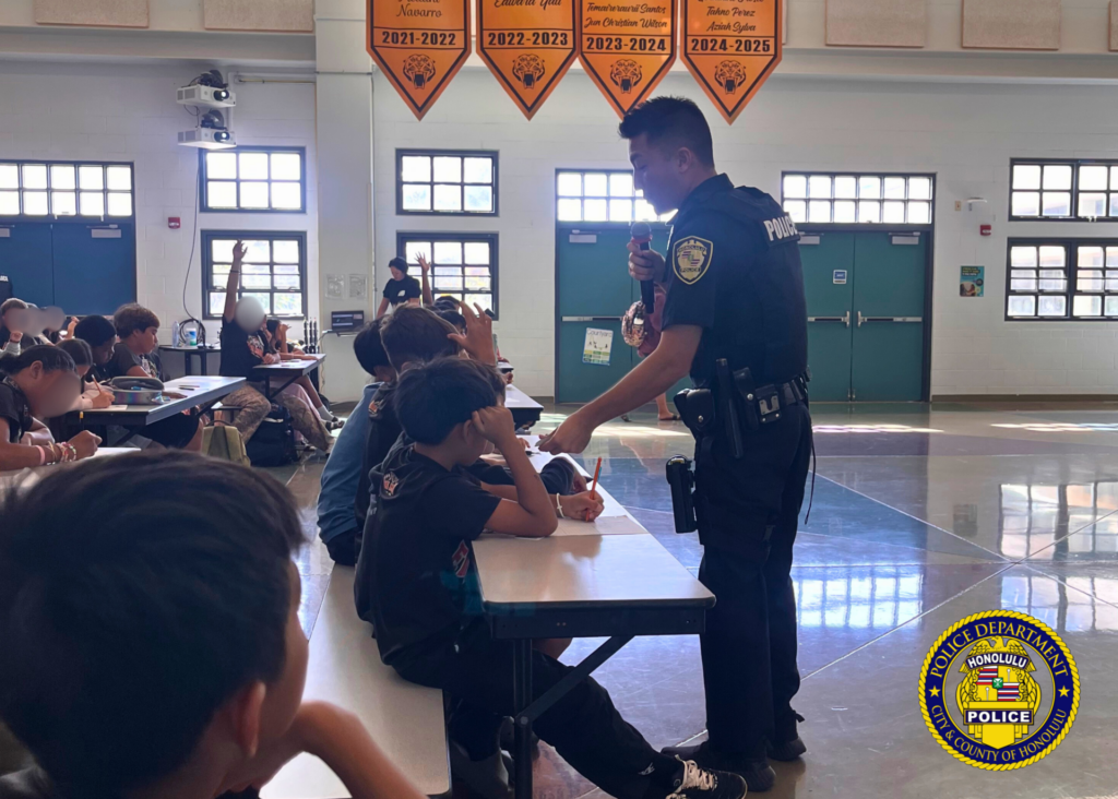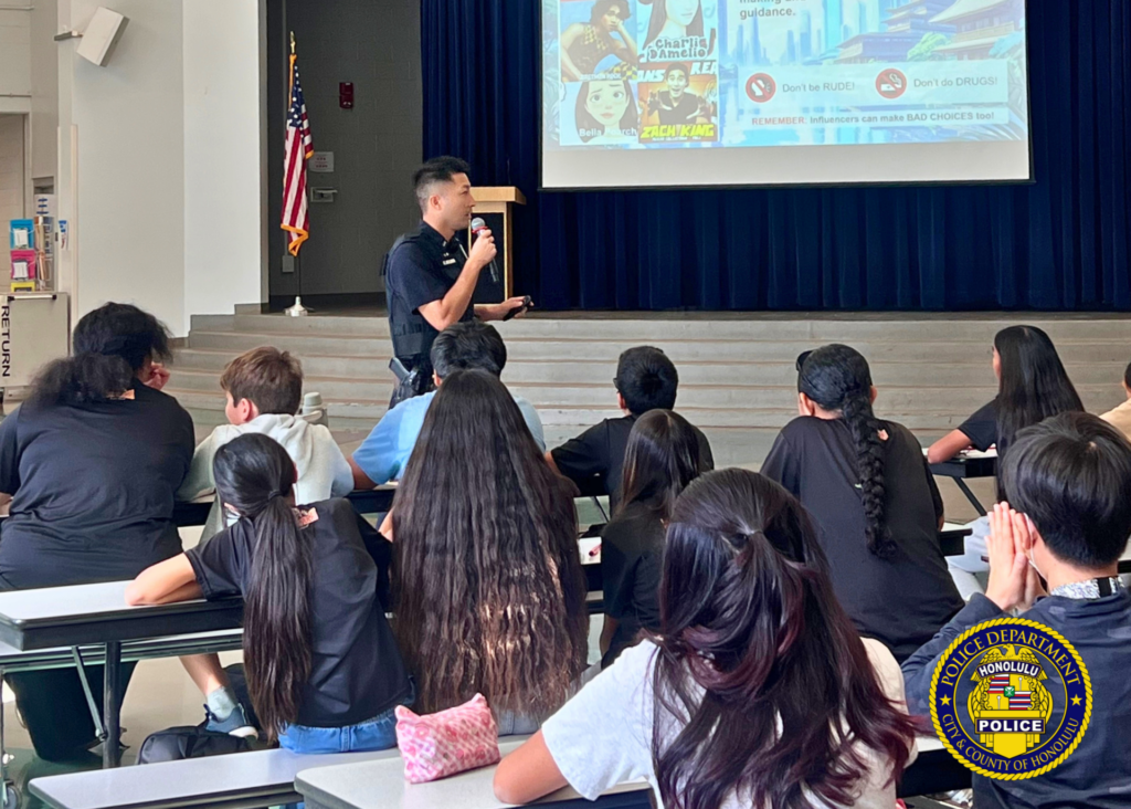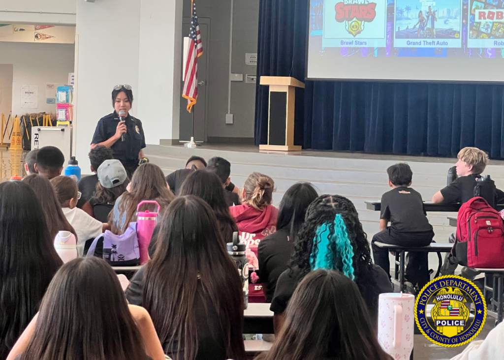 Earlier this month, officers from the District 8 Community Policing Team, Weed and Seed Hawaiʻi, and the State of Hawaiʻi Department of the Attorney General’s Office hosted an educational assembly at ʻEwa Makai Middle School. This event reached approximately 400 students and focused on the dangers of vaping and its health risks, as well as the serious impact of bullying and cyberbullying.
