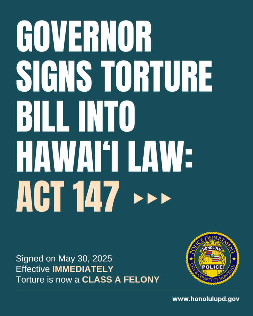 Read more here: Governor Signs Groundbreaking Torture Bill into Hawai‘i Law with Full Support from HPD Homicide Detail