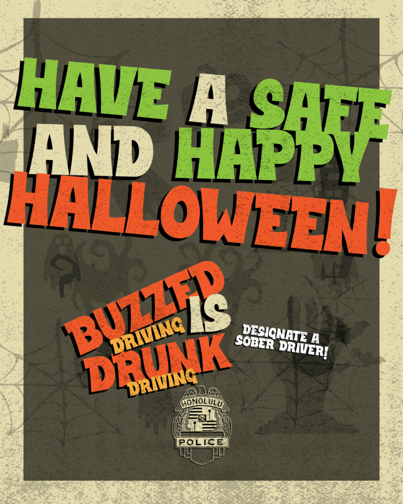 🎃👮♂️ The Honolulu Police Department reminds you to have a fun, safe, and spooky Halloween! If you’re celebrating, remember: buzzed driving is drunk driving. Plan ahead and designate a sober driver. 🚫🍸🚗 #HalloweenSafety #DriveSober #SaferRoadsTogether #DriveWithAloha #SafeEveryMile