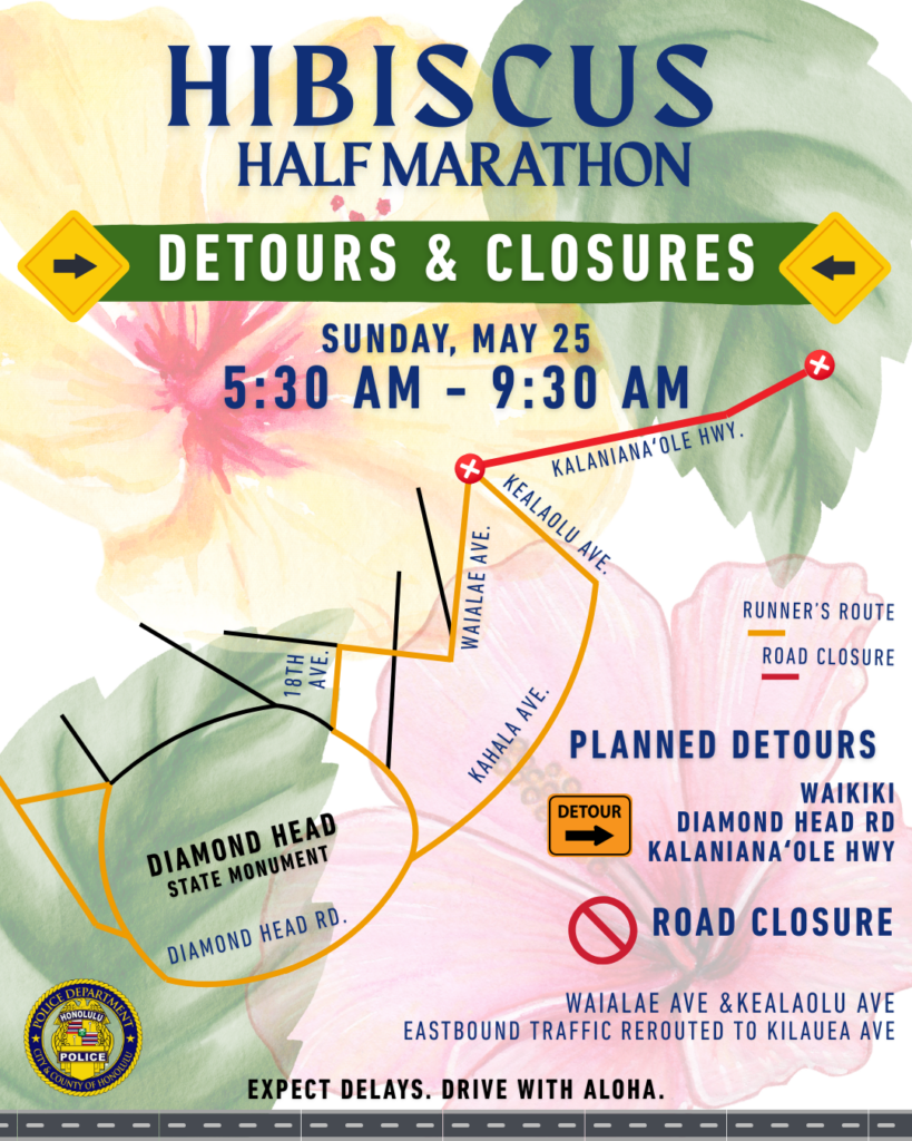 Waialae Ave + Kealaolu Ave will be closed from 5:30–9:30 AM this Sunday for the Hibiscus Half Marathon.