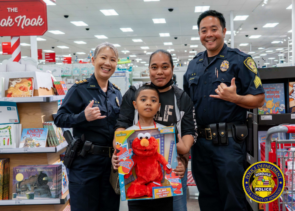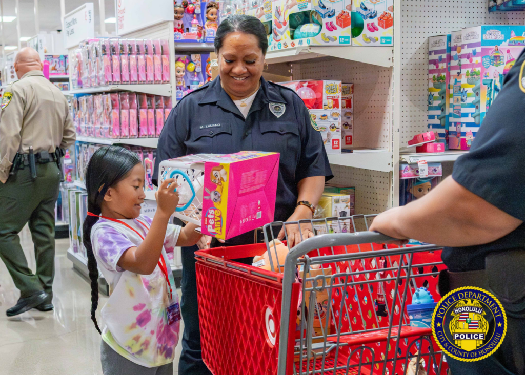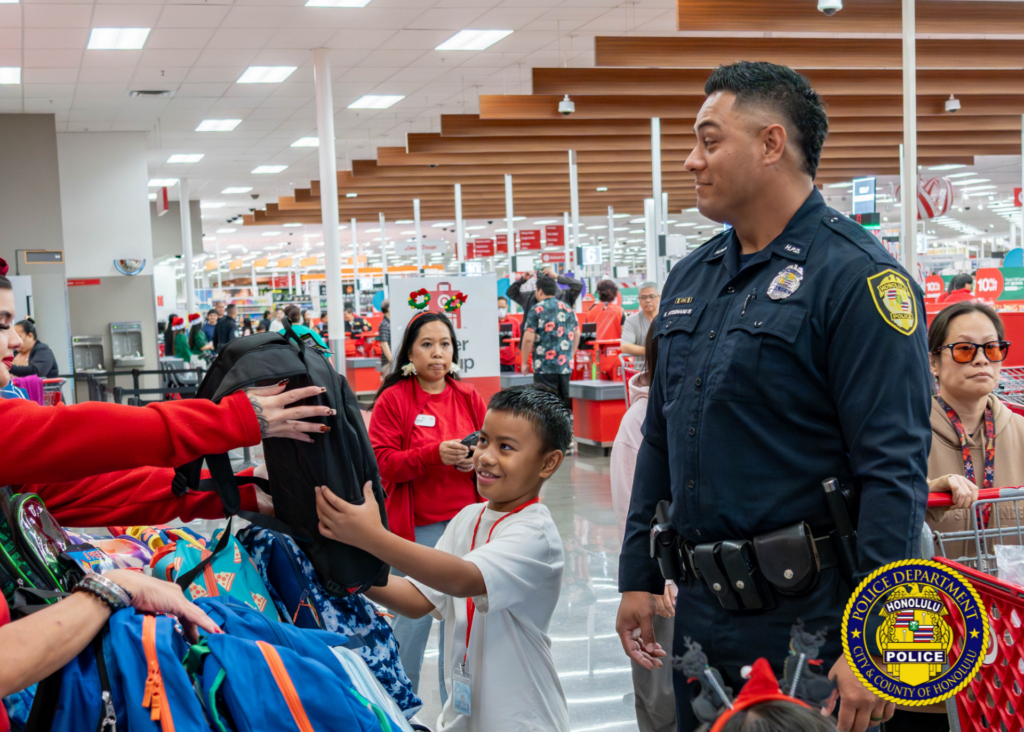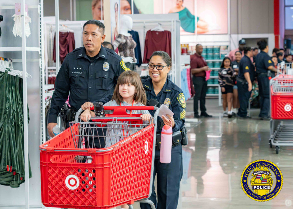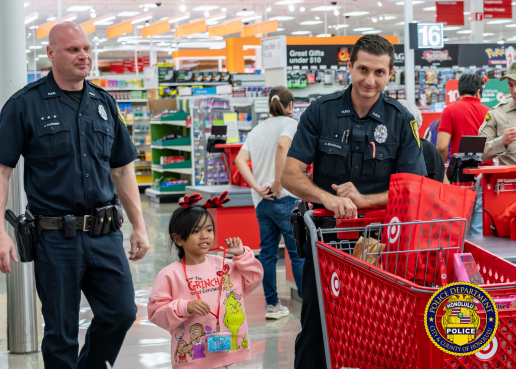 HPD’s District 5 Community Policing Team, with the support of Target Salt Lake, Weed and Seed Hawaiʻi, Locations Foundation, and McDonald’s, hosted the annual “Heroes and Helpers” Christmas shopping event at Target Salt Lake, pairing local keiki with hero shoppers from law enforcement, fire, military, and federal agencies.
