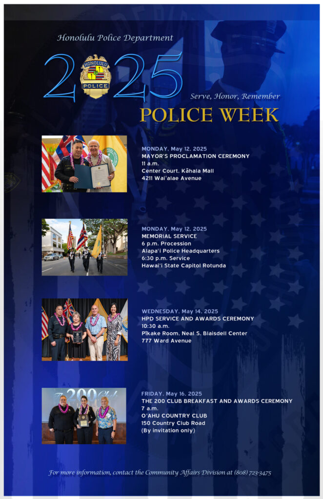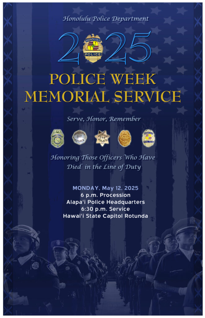 The Honolulu Police Department (HPD) will commemorate National Police Week 2025 with events scheduled throughout the week beginning on Monday, May 12, 2025. Police Week is observed across the nation as a time to honor and remember law enforcement officers killed in the line of duty and those who continue to protect and serve our community.