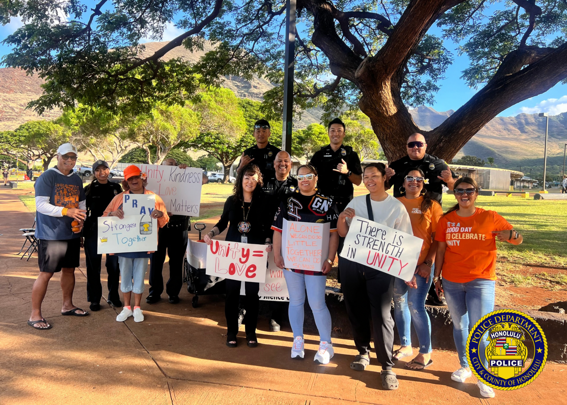 On October 24, officers from the District 8 Community Policing Team joined Nānākuli High and Intermediate School students and staff for their SHINE Day initiative. The message for October was “Unity Draws a Community Together,” in observance of Unity Day, which focuses on bullying prevention by uniting in aloha. They waved signs and handed out snacks with encouraging messages like “Unity, kindness, love. It all matters.” Building stronger communities together.