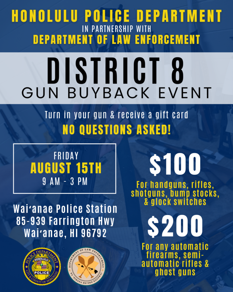 Waiʻanae Police Station: Gun Buyback Event, August 15, 2025 August 11, 2025 View this content on social media & share: Instagram | Facebook | X | Nextdoor | YouTube | TikTok News Release: Click here